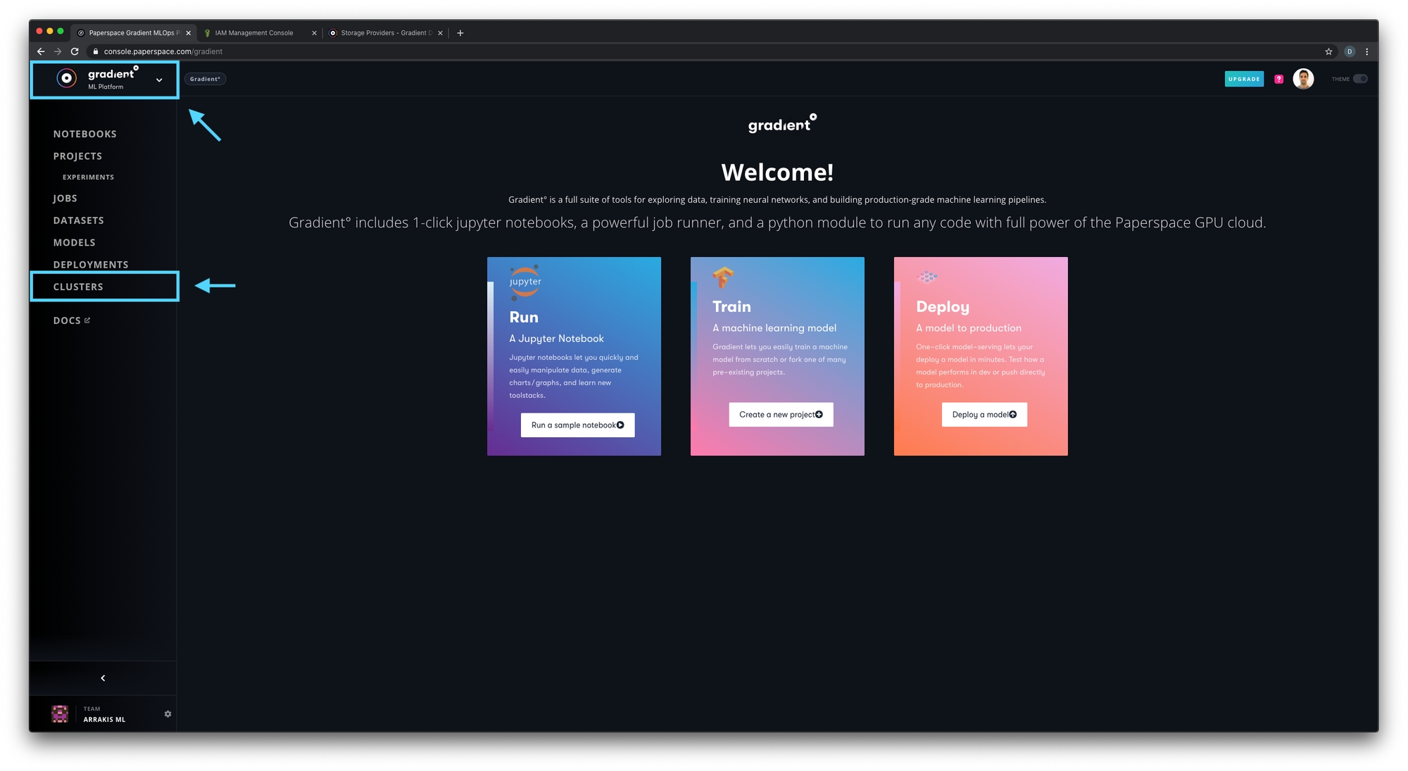 Gradient clusters can be created in just a few clicks in the Web UI. Create and run notebooks, experiments, and deployments all in your private cluster from within the Web UI, from the CLI, or using the SDK.