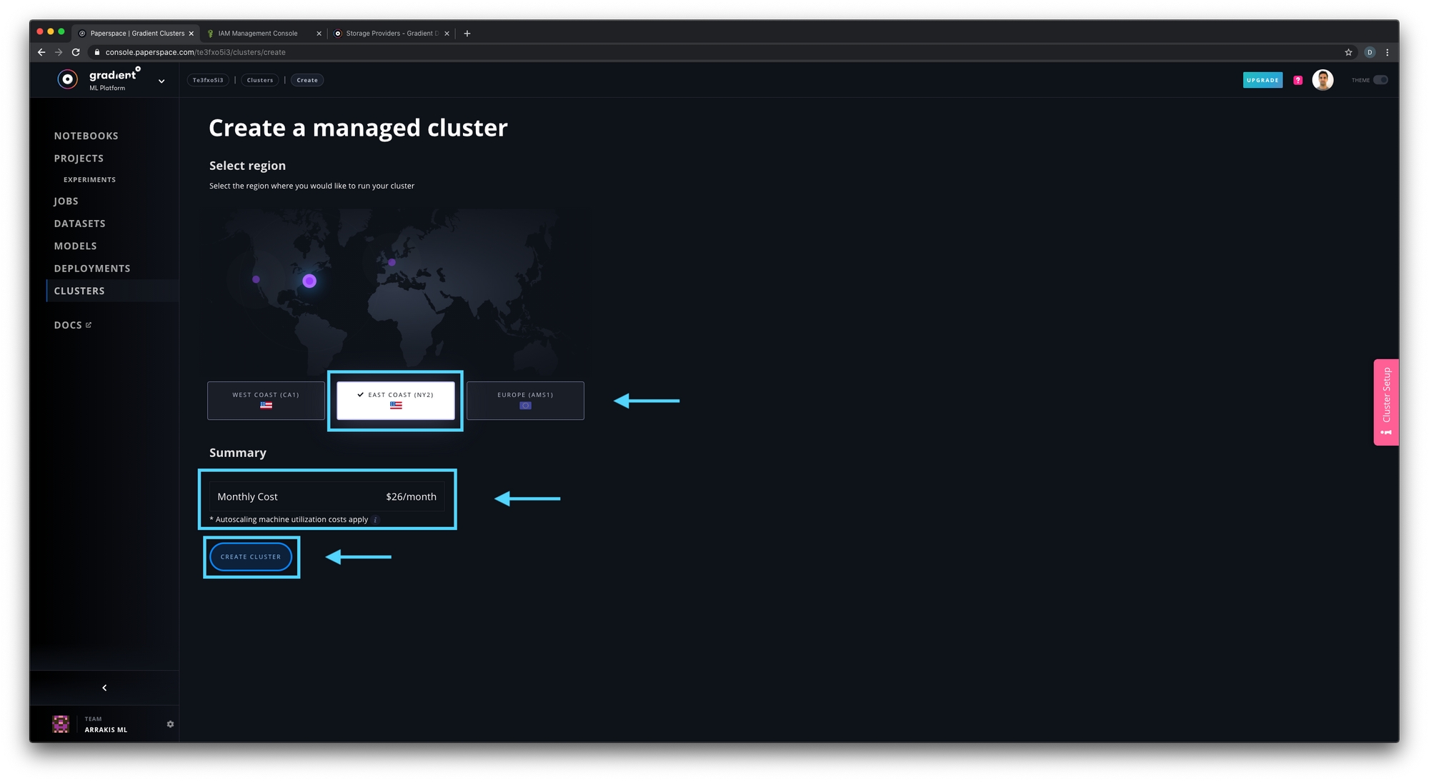 Select the Paperspace Cloud region where your machines will be provisioned. Then select Create Cluster.